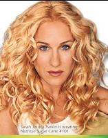 SARAH JESSICA PARKER. Though her hair grows out of her head (as opposed to her knees) dark brown, Sarah has been various shades of blonde over the years. Most of the time, she's more of a highlighted blonde, which she can usually get away with since her naturally curly hair adds enough funkyness to offset the darker streaks or roots. At least that's the theory. =) Anyway, Sarah recently signed her first endorsement contract and with a haircolor company no less - Garnier (which is a division of L'Oreal), producer of Nutrisse haircolor. As was mandated several years ago by law, celebrities can't endorse such products unless they actually use them, so the colorists as Nutrisse got the opportunity to put their own blonde spin on Sarah's curls. The resulting shade is a REALLY bright golden, yellow blonde called "Sugar Cane" (Of course it is. What else would you call it? "Way Big Blonde"?). Anyway, Sarah was herself a bit taken aback at just how blonde it was and even called her husband, Matthew Broderick, to warn him that it was a stark contrast before she came home. Apparently, the are now both happy with it (though it's a bit TOO unnaturally blonde for my tastes) and Sarah says she can even do the color at home herself. Well, at least until that contract runs out.